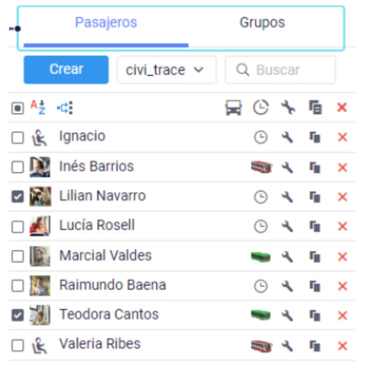 Desde esta lista, es posible ver a qué bus está asignado o en cuál se encuentra actualmente a bordo, así como consultar los registros de subidas y bajadas asociados. Esto permite tener una trazabilidad clara y en tiempo real, facilitando el control operativo, la atención de emergencias o el análisis de asistencia.